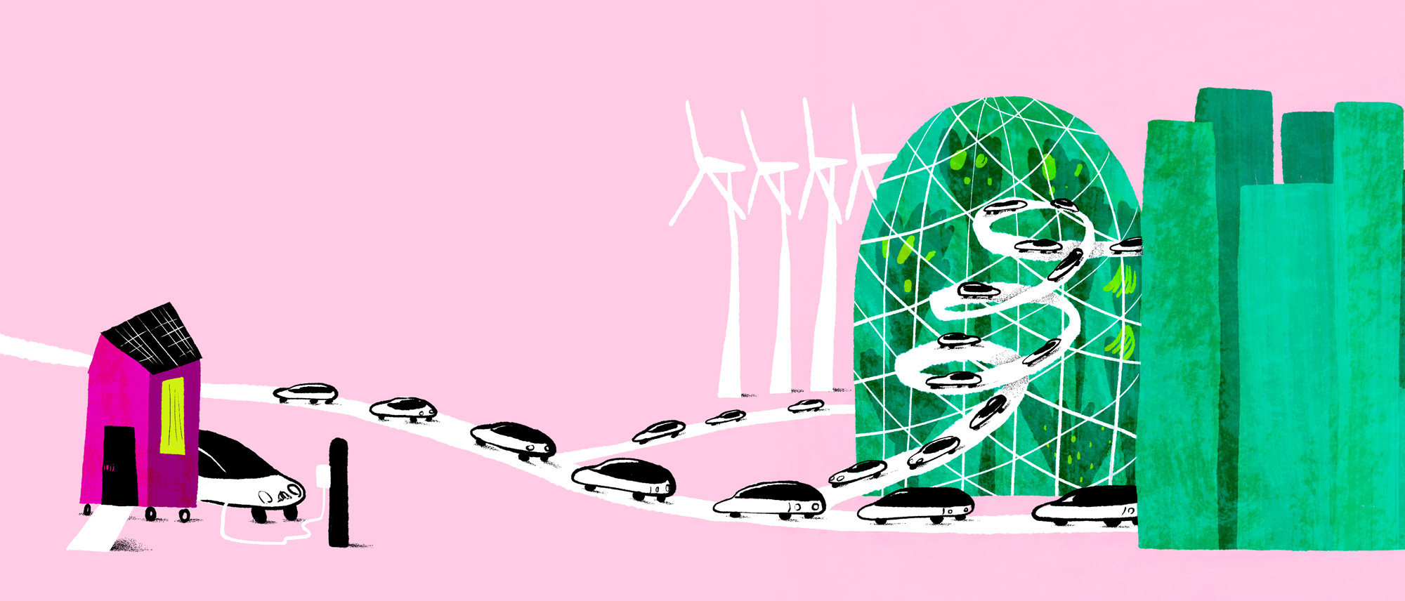Perfekt. Klokken er 16, og BRT 150 ankommer på slaget til Nyhavnsgade i Aalborg. Du er på vej hjem fra et møde og tager en af de ‘overjordiske metrolinjer’, som de bliver kaldt. BRT står for Bus Rapid Transit, og de er overalt i landets største byer. Med deres særlige spor på vejen, så bilerne ikke kommer i vejen. Ja, de kører stadig selv deres biler inde i de store byer, så meget stoler vi alligevel ikke på teknologien, at vi tør lade bilerne styre rundt mellem fodgængere og cyklister af sig selv. Teknologien fungerer ellers fint andre steder. I udlandet og uden for byerne. Derfor føler du dig også foran byboerne, da du står af i udkanten af byen for at finde din selvkørende delebil. Den kører på sol- og vindenergi, og du sætter dig bare ind, taler til computeren, så finder den selv hjem til dit stråtækt hus på Mors. Dejligt nemt. Så kan de have deres storbyer for sig selv, tænker du, mens du slapper af med nyhederne på TV i bilen.