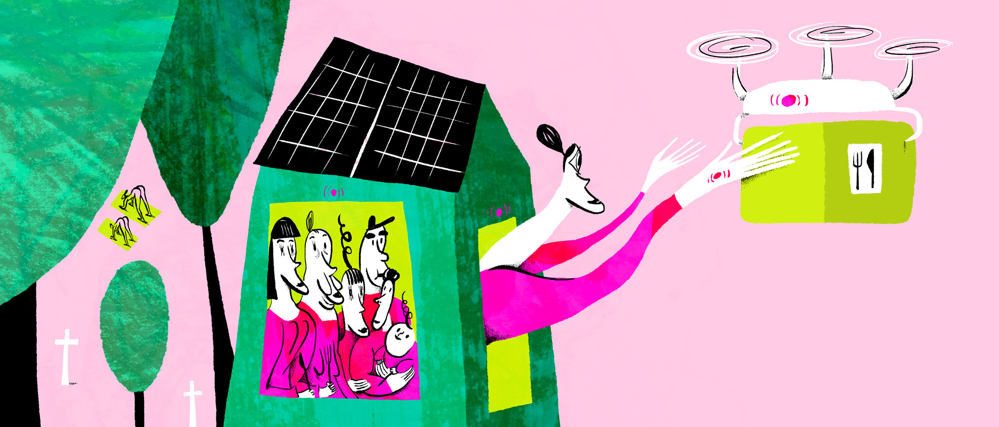 Betalte du virkelig så meget for at bo et godt sted, som du så ikke havde særlig meget tid til at nyde? Fordi du skulle arbejde og rejse frem og tilbage for at have råd til det – hvor fjollet! Og hvad skulle du også bruge et samtalekøkken til, nu hvor du får maden leveret? Så hellere et tredje badeværelse eller et større hjemmekontor, når du alligevel arbejder hjemme og deler dit hjem med flere. Bedstemor i kælderen, to fraskilte mødre der deles om ansvaret for børnene. Væk fra byen. Tæt på naturen. Men stadig med fortiden i hånden. 80 procent af landets tre millioner boliger var allerede bygget i 2021 – nu er flere af dem bare blevet højere, de er blevet slået sammen, bæredygtige og ligefrem rentable. Solceller på taget, rensning af eget spildevand i kælderen, og ude i skuret sikrer et batteri, at du kan sælge boligens overskydende energi. Tænk, at du engang betalte for at bo. Nu udlejer du altid, når du er væk hjemmefra, og du kender flere med de såkaldte tiny houses – små huse med hjul, som de flytter rundt på for at kunne vågne op til en ny udsigt fra soveværelset.